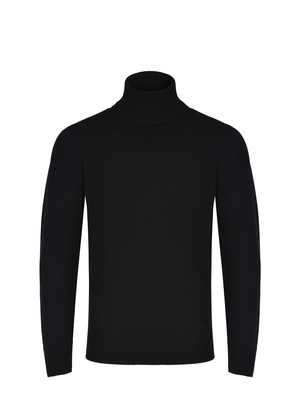 Maglia Emporio Armani realizzata in lana di colore Nero. Collo alto a coste. Maniche lunghe. Monogram logo ricamato tono su tono sul fondo sul davanti. Polsini e fondo a coste.100% lana Made in Italy