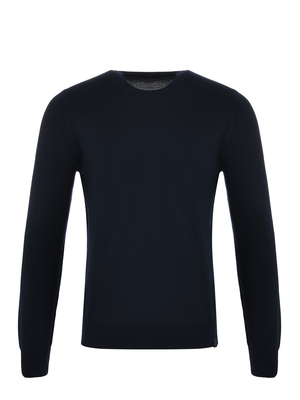Maglia Fay in lana rasata Blu scuro. Finezza 12. Girocollo a costine. Manica lunga. Polsini e fondo a costine. Patch logo sul fondo. Misura nella foto 48100% lana vergine