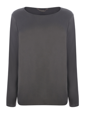 Maglia Max Mara Leisure " Moldava" realizzata in raso di seta stretch di colore Grigio Antracite. Scollo tondo. Maniche lunghe. Linea fluida. 93% Seta, 7% Elastan Made in Italy
