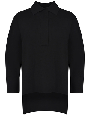 Maglia Max Mara " Vand" realizzata in viscosa crêpe di colore Nero. Colletto polo con bottoni nascosti. Maniche lunghe con logo ricamato in filo sul polso sinistro. Spacchi con bottone a pressione sui polsi. Spacchi laterali e fondo asimmetrico leggermente più lungo sul retro.65% viscosa 35% poliammide Made in Italy