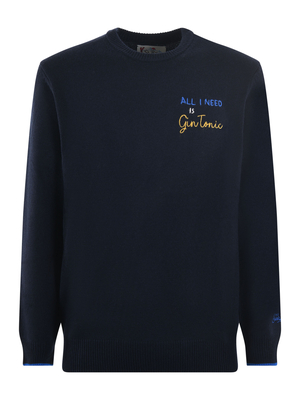 Maglia MC2 Saint Barth in misto lana e cashmere Blu scuro. Ricamo frontale "need gin". Girocollo. Manica lunga. Misura in foto M40% lana, 25% viscosa, 10% cashmere, 25% poliammide