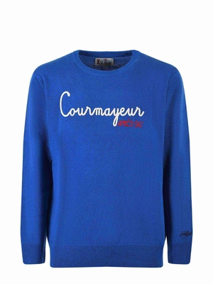 Maglia MC2 Saint Barth in misto lana e cashmere Blu cobalto. Girocollo a costine. Ricamo frontale a rilievo " Courmayeur Aprè-ski". Manica lunga. Polsi e fondo a costine. Misura in foto M35% lana, 30% viscosa, 20% cshmere, 15% poliammide Made in Italy