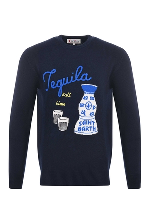 Maglia MC2 Saint Barth in misto lana e cashmere Blu scuro. Ricamo a rilievo frontale "Tequila"e intarsio. Girocollo a costine. Manica lunga. Polsi e fondo a costine.Misura in foto M40% lana, 25% viscosa, 25% poliammide, 10% cashmere