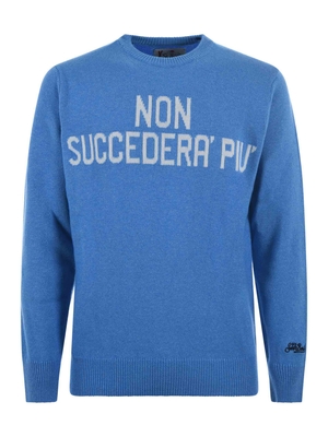 Maglia MC2 Saint Barth in misto lana e cashmere Azzurro. Intarsio frontale "non succederà più". Girocollo. Manica lunga. Misura in foto M35% lana, 30% viscosa, 20% cashmere, 15% poliammide