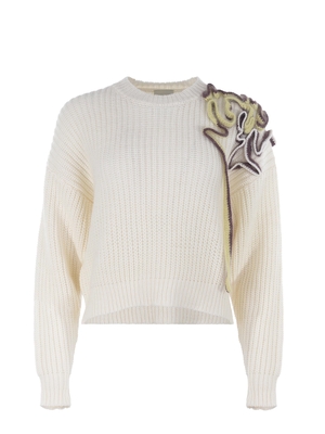 Maglioncino Alysi in misto lana Off white. Girocollo a coste. Maniche lunghe.Fondo e polsini a coste.Dettagli in rilievo ricamati sulla spalla a contrasto.Vestibilità Regular Fit.50% lana 50% acrilico