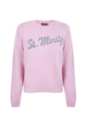 Maglioncino MC2 Saint Barth in lana e cashmere Rosa. Logo frontale intarsiato e decorato con strass. Girocollo. Manica lunga. Misura in foto S40% lana, 25% viscosa, 25% poliammide, 10% cashmere