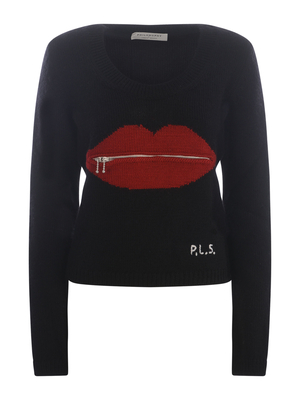 Maglioncino Philosophy in lana vergine di colore Nero. Girocollo a coste. Maniche lunghe. Dettaglio " Labbra Rosse" intarsiate davanti con zip in metallo, funzionali davanti. Portate aperte creano un effetto cut-out. Ricamo logo a contrasto Bianco "P.L.S" sul fronte. Polsi e fondo a costine. Slim fit. 100% Lana Vergine Made in Italy