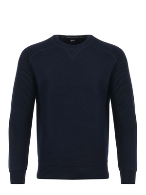 Maglione Boss in filato grosso di cotone Blu scuro. Pannello frontale in lana cotta. Girocollo a costine con motivo felpa. Maniche raglan lunghe. Polsi e fondo a costine. Regular fit. 70% cotone, 30% lana vergine