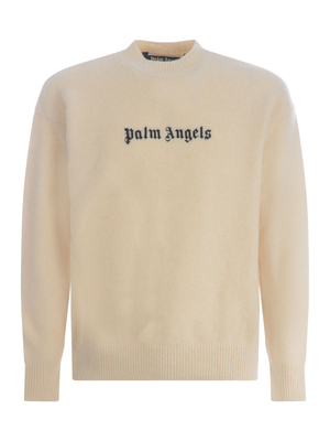 Maglione Palm Angels " Classic Logo" in lana di colore Crema. Girocollo a costine. Maniche lunghe. Lettering logo " Palm Angels" a contrasto Nero sul petto. Patch logo applicato di lato. Polsi e fondo a costine.72% Merino, 20% Poliammide, 6% Cashmere, 2% Elastan Made in Italy