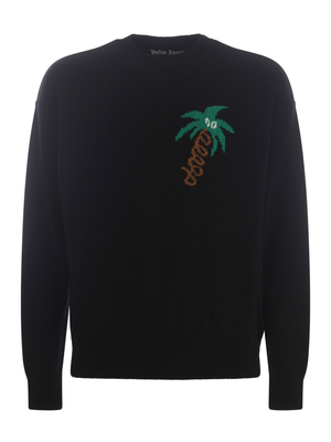 Maglione Palm Angels " Sketchy" in lana di colore Nero. Girocollo a costine. Maniche lunghe. Logo " Palm-A-Like" intarsiato a contrasto Marrone e Verde sul petto. Polsi e fondo a costine. 40% Lana, 30% Viscosa, 20% Poliammide, 10% Cashmere Made in Italy