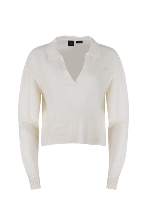 Maglione Pinko " Profumo" realizzato in misto cashmere di colore Off White. Colletto. Scollo a punta. Maniche lunghe. Logo " Love Birds" ricamato tono su tono sul petto. Polsi e fondo a costine. Spacchi laterali. 71% Cashmere, 14% Lyocell, 6% Viscosa, 2% Elastan