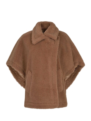 Mantella Max Mara " Tebe" realizzata in misto lana e alpaca di colore Cammello. Tessuto Teddy. Colletto doppio a rever o chiuso con bottone. Maniche corte a kimono. Chiusura asimmetrica con bottone. Tasche a filo diagonali sui fianchi. Spacchetti laterali. Foderata.88% cammello 12% seta Made in Italy