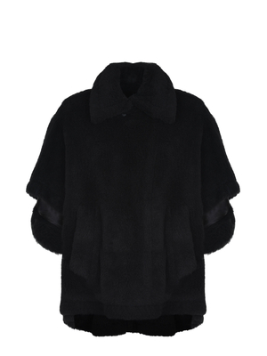 Mantella Max Mara " Tebe 1" realizzata in misto lana e alpaca di colore Nero. Tessuto Teddy. Colletto doppio a rever o chiuso con bottone. Maniche corte a kimono. Chiusura asimmetrica con bottone. Tasche a filo diagonali sui fianchi. Spacchetti laterali. Foderata.62% alpaca 26% lana 12% seta Made in Italy