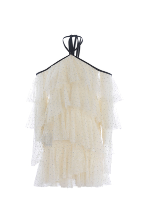 Abito Philosophy in pizzo Crema. Dettaglio stampa Pois in glitter Argento. Spalle scoperte. Fiocco di colore Nero che si allaccia al collo. Maniche lunghe. Balze. Regular fit. 100% Poliammide Made in Ungheria Off-the-shoulder Foderato VESTIBILITÀ Regular fit
