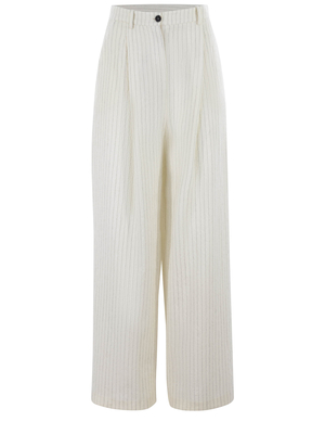 Pantaloni Alysi in lana Off white. Motivo gessato a contrasto.Chiusura con bottone e zip. Passanti per cintura.Pence sul davanti. Tasche laterali a filo. Tasca sul retro a filo.Gamba ampia.Vestibilità oversize.100% lana vergineMade in Italy