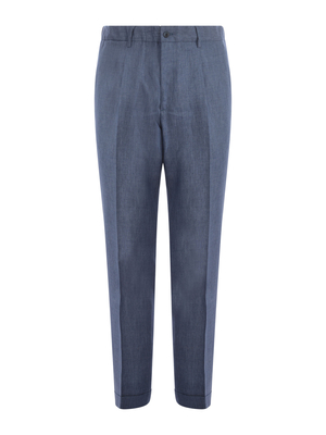 Pantaloni Briglia "Isola" in lino di colore Azzurro. Elastico in vita. Coulisse interna. Passanti per cintura. Tasche laterali. Chiusura con zip e bottone. Tasche a filo con bottone sul retro. 100% LinoMade in Italy