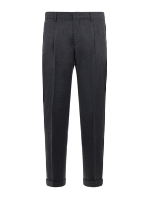 Pantaloni Briglia " Tiberios" in lana e cashmere Grigio scuro melange. Passanti per cintura. Chiusura con gancio, zip e bottone nascosti. Tasche laterali. Pience davanti. Tasche a filo sul retro. Risvolto cucito al fondo.90% Lana Vergine, 10% Cashmere Made in Italy
