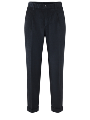 Pantaloni Briglia in velluto a coste Blu scuro. Tasche america. Tasche posteriori a filo con bottone. Passanti per cintura. Pinces frontali. Chiusura con zip e bottoni. Risvolto cucito al fondo. Slim fit. Misura in foto 3190% poliestere, 10% poliammidica