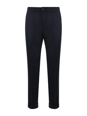 Pantaloni Briglia in lana vergine stretch di colore Blu scuro. Elastico in vita. Passanti per cintura. Chiusura con bottone e zip. Pience davanti. Tasche laterali. Tasche a filo con bottone sul retro.99% Lana Vergine, 1%ElastanMade in Italy
