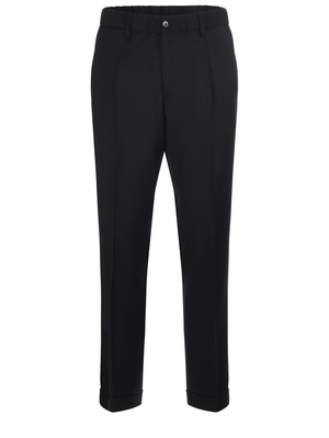 Pantaloni Briglia in lana vergine stretch Nero. Elastico in vita. Passanti per cintura. Chiusura con bottone e zip. Pience davanti. Tasche laterali. Tasche a filo con bottone sul retro.99% Lana Vergine, 1%ElastanMade in Italy