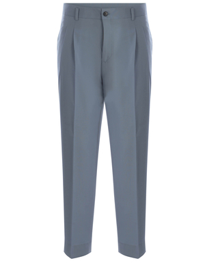 Pantaloni Costumein realizzati in fresco lana di colore Celeste Polvere. Passanti per cintura. Pience davanti. Chiusura con zip e bottone. Tasche laterali. Tasche a filo posteriori.100% Lana Vergine