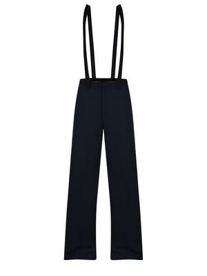 Pantaloni Dondup " Tecla" realizzati in misto lana di colore Blu notte. Bretelle in raso regolabili. Chiusura con gancetti e zip. Logo monogram in metallo di colore Argento laterale. Tasche laterali.95% lana vergine 5% elastene Made in Italy