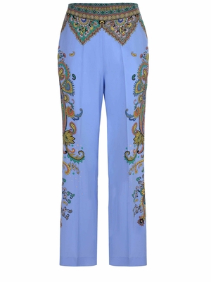 Pantaloni Etro realizzati in seta di colore Celeste.Stampa floreale.Gamba ampia. Vita elasticizzata sul retro.Chiusura con zip invisibile laterale.Tasche laterali.100% setaMade in Italy