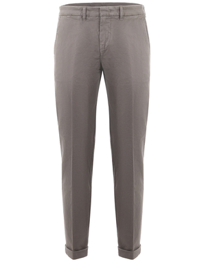 Pantaloni Fay in gabardine stretch Tortora. Effetto manopesca. Tasche america. Tasche posteriori a filo con bottone. Passanti per cintura. Chiusura con zip e gancio. Risvolto da 3, 5 cm cucito. Misura in foto 3398% cotone, 2% elastene