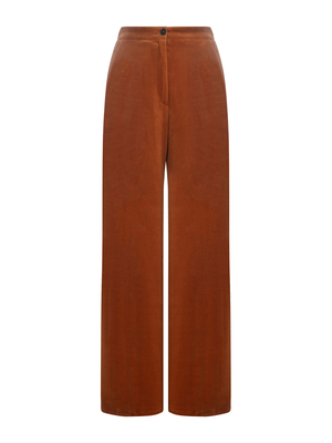 Pantaloni Forte Forte realizzati in ciniglia di cotone di colore Terra. Vita alta. Elastico sul retro. Chiusura con zip e bottone. Tasche laterali. Gamba ampia. Linea morbida. 80% Cotone, 20% Poliestere Made in Italy