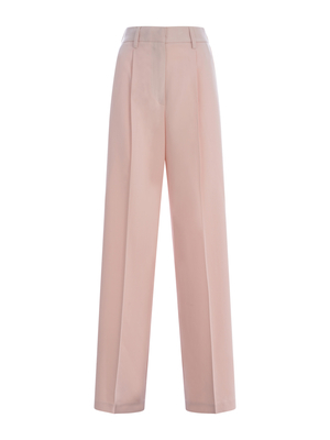 Pantaloni Forte Forte realizzati in twill di lana e viscosa di colore Rosa. Vita alta. Elastico in vita. Passanti per cintura. Pience davanti. Chiusura con gancio, zip e bottone. Tasche laterali. Gamba larga. Linea morbida. 79% Viscosa, 18% Lana, 3% Elastan Made in Italy