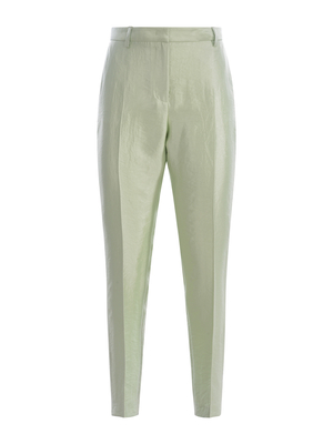 Pantaloni a sigaretta Manuel Ritz in poliviscosa lucido di colore Verde Menta. Passanti per cintura. Tasche laterali. Chiusura con gancio zip e bottone. Tasca a filo sul retro. 67% Viscosa, 19% Poliammide, 14% Poliestere Made in Italy