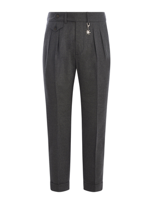 Pantaloni Manuel Ritz in lana vergine di colore Grigio Scuro. Passanti per cintiura. Dettaglio iconico del brand applicato al passante. Taschino con bottone di lato. Chiusura con gancio e bottone. Tasche laterali. Tasche con patta e bottone sul retro. Patch logo a contrasto applicato sul retro. 98% Lana, 2% Elastan Made in Ucraina