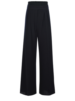 Pantaloni Max Mara " Piroghe" realizzati in tela di lana vergine di colore Blu marino. Motivo gessato. Vita alta. Pinces frontali. Tasche laterali. Chiusura con zip e bottone. Shorts interno. Shorts con vita elasticizzata. Rimovibile. Gamba larga. 79% Lana Vergine, 21% Viscosa Made in Italy