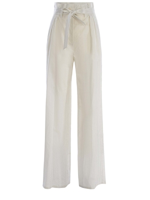 Pantaloni Max Mara " Xero" realizzati in tela di cotone e seta gessata di colore Bianco. Gessato di colore Nero. Pinces davanti. Passanti per cintura. Cintura da annodare a fiocco davanti. Tasche laterali. Chiusura con bottone e zip nascosti. Tasche a filo sul retro. Linea ampia. Gamba palazzo. 80% Cotone, 20% Seta Made in Italy