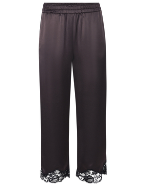 Pantaloni palazzo Pinko " Pendolo" realizzati in satin lavorato di colore Bougundy. Texture fluida e lucida. Elastico in vita. Tasche laterali. Linea ampia e dritta. Inserto in pizzo a contrasto Nero al fondo. Pizzo 80% Cotone, 20% Nylon 91% Acetato, 9% Poliestere