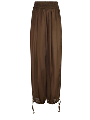 Pantaloni Philosophy realizzati in seta di colore Marrone. Fascia elasticizzata in vita. Tasche laterali. Coulisse sul fondo regolabili. Fodera a short interna.100% seta Made in Italy