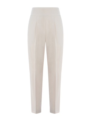 Pantaloni Pinko " Natalia" in crêpe stretch di colore Avorio. Vita alta. Pence davanti. Tasche alla francese. Chiusura con zip invisibile sul retro. Gamba dritta. Piega stirata davanti e sul retro. Linea morbida. Fodera 65% Acetato, 35% Poliestere 98% Poliestere, 2% Elastan Made in Italy
