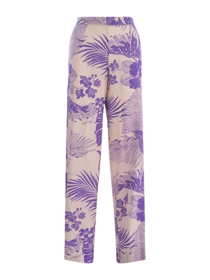 Pantaloni Pinko " Pacato" in crêpe marocaine di viscosa di colore Rosa Cipria. Stampa fantasia " Tropicale" a contrasto Viola all-over. Vita alta con elastico sul retro. Chiusura con zip invisibile laterale. Linea diritta. Leggermente svasato al fondo. 100% Viscosa Made in Italy