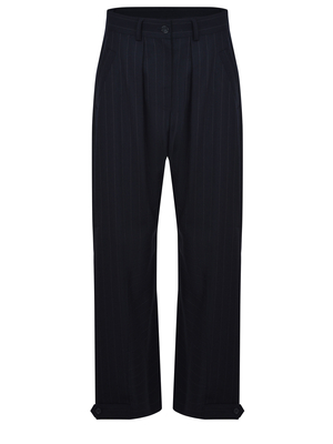Pantaloni Pinko " Pastasfoglia" realizzato in misto lana di colore Blu. Motivo gessato. Chiusura con bottone e zip. Passanti per cintura. Pences sul davanti. Tasche laterali. Tasca sul retro. Bottoni regolabili sul fondo. Ballon Fit.54% poliestere 44% lana 2% elastene Made in Italy