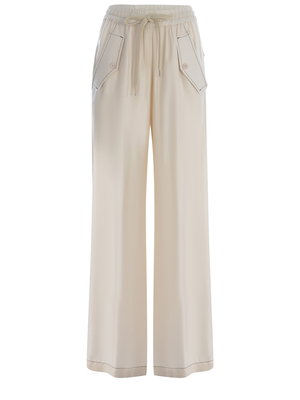 Pantaloni Pinko " Perdono" realizzati in twill di colore Crema. Impunture a contrasto di colore Nero. Vita alta. Elastico in vita con coulisse. Tasche con patta e bottone, laterali. Gamba, linea dritta e ampia. Tasche con patta sul retro.100% Viscosa Made in Italy