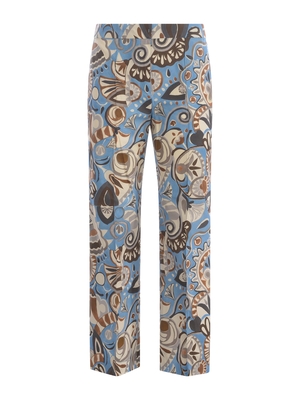 Pantaloni 'S Max Mara "Licia" in popeline di cotone stretch di colore Celeste. Fantasia all-over. Bustino. Chiusura cob gancio, zip e bottone. Tasche laterali. Linea leggermente svasata al fondo. 97% Cotone, 3%ElastanMade in Italy