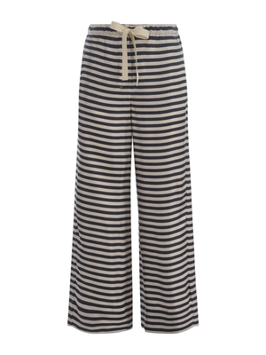 Pantaloni 'S Max Mara "Tempera" in twill di pura seta di colore Ecru. Motivo a righe di colore Nero. Elastico in vita con coulisse. Chiusura con gancio, zip e bottone. Tasche laterali. 100% SetaMade in Italy