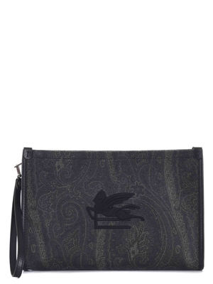 Pochette Etro in tela di cotone spalmato fantasia paisley Grigio scuro/ Nero. Logo ricamato davanti Nero. Manico da polso in pelle, removibile. Profili in pelle. Chiusura con zip. Tasca interna. Foderata. Accessori metallici con finitura argento. Misure: 20 cm x 30 cm x 6 cm Esterno 54% cotone, 46% poliestere Finiture 100% Pelle di Vitello Made in Italy