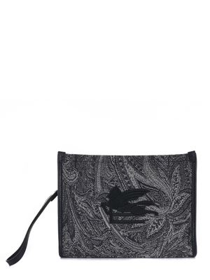 Pochette Etro in tela di cotone fantasia paisley color Blu scuro. Logo ricamato davanti Nero. Manico da polso in pelle, removibile. Profili in pelle Blu scuro. Chiusura con zip. Tasca interna. Foderata. Accessori metallici con finitura argento. Misure 25 cm x 19 cm x 4 cm Esterno 54% cotone, 46% poliestere Finiture 100% Pelle di Vitello Made in Italy
