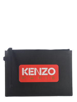 Pochette Kenzo in pelle liscia di colore Nero. Lettering logo " Kenzo" in rilevo, contrasto Rosso. Tracolla da polso. Chiusura con zip. Fodera in cotone. Tasca piatta interna. Uno slot per carte all'interno. Logo " Kenzo Paris" stampato all'interno. Dimensioni 28cm x 19cm x 3cm Lunghezza cinturino da polso 17cm 100% Pelle di Bovino Made in Vietnam