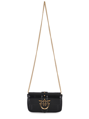 Pochette Pinko " Love One Simply" realizzata in pelle lucida di colore Nero. Inserti in metallo Dorato. Chiusura in pelle, dettaglio " Borchie" applicate. Chiusura con iconica fibbia " Love Birds Diamond Cut" in metallo Dorato, lettering " Pinko" inciso. Interno foderato in microfibra. Tasca con zip, interna. Tracolla in catena Dorata, rimovibile. Misure Altezza 12cm, Larghezza 3cm, Lunghezza 20cm Fodera 100% Poliestere 100% Pelle