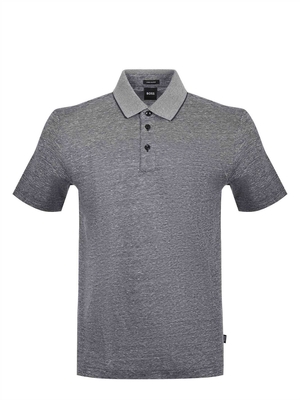 Polo Boss in filato di misto lino e cotone Blu scuro effetto melange. Colletto a costine con chiusura a tre bottoni. Manica corta. Spacchetti al fondo.Misura in foto M50% lino, 50% cotone