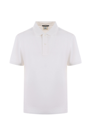 Polo C.P. Company in piqué di cotone Bianco latte. Colletto a costine. Maniche corte. Chiusura con due bottoni. Lettering ricamato sul petto. Spacchetti ai lati. Slim fit. 95% Cotone, 5%Elastan