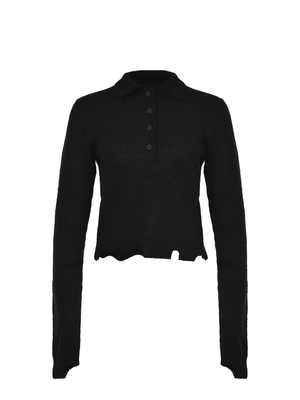 Polo Cycle realizzata in misto alpaca e lana di colore Nero. Colletto classico. Bottoni sul petto. Maniche lunghe. Dettaglio fondo e maniche asimmetrico. Monogram logo applicato sul retro in metallo Argento.38% alpaca 38% lana 24% poliestere
