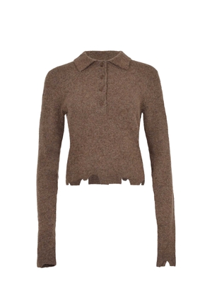 Polo Cycle realizzata in misto alpaca e lana di colore Nocciola. Colletto classico. Bottoni sul petto. Maniche lunghe. Dettaglio fondo e maniche asimmetrico. Monogram logo applicato sul retro in metallo Argento.38% alpaca 38% lana 24% poliestere